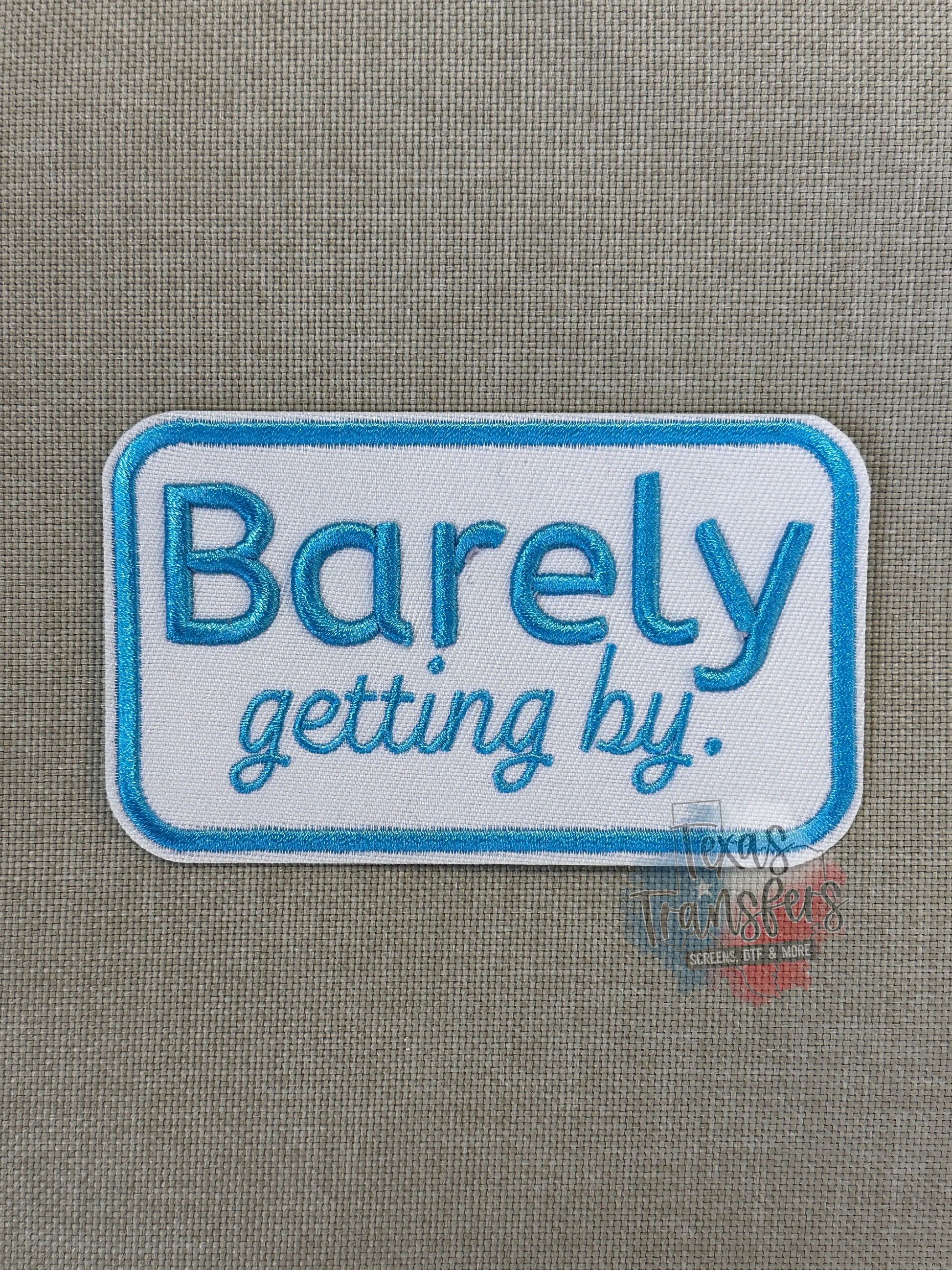 Add some real-world humor to your look with the “Barely Getting By” Iron-On Patch, available now from Texas Transfers and Designs.